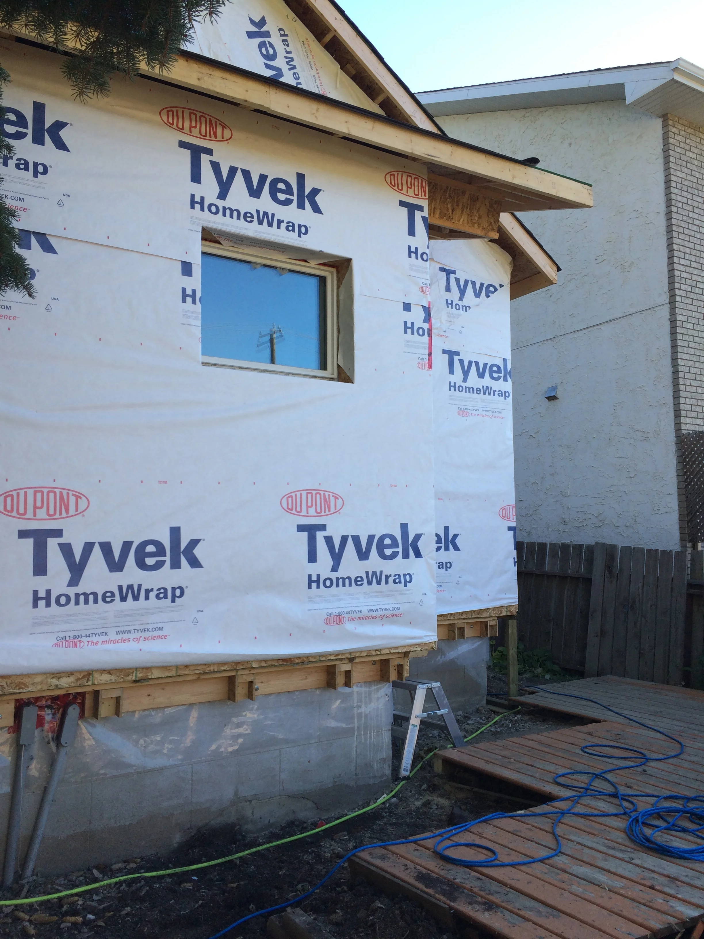 Our exterior work gives credence to the Saskatchewan pioneers, Harold Orr & Rob Dumont, and could be described as a Chainsaw Retrofit. The idea is to strip the home down to roof & wall sheathing, and cut off the roof eaves so that you have a smooth surface to work with. You then apply a continuous poly air/vapor barrier over the entire surface, sealing it to the exterior foundation wall. This poly is followed by copious amounts of insulation, supported by framing, new sheathing, and then new roofing/siding.